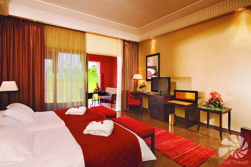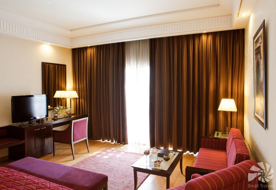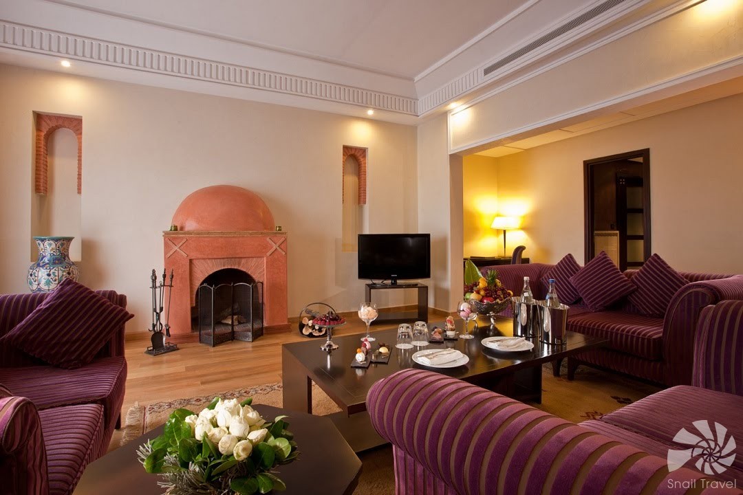 Hotel disponuje prostornými pokoji a suity s privátními balkony nebo terasami, odkud se otevírá výhled do zahrad, na bazén či pohoří Atlas. Elegantní interiéry kombinují orientální detaily s moderním vybavením – klimatizací, satelitní TV, Wi-Fi a luxusními koupelnami.